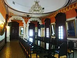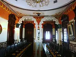 Estaba este recinto adornado con candiles, vitrales, cortinajes de terciopelo, columnas coronadas de capiteles dorados y consolas de mármol, lo que era sin duda alguna la imitación de lujo palaciego europeo, pero que al fin de cuentas daban ya al pueblo tabasqueño una casa para la sede de sus autoridades principales.
