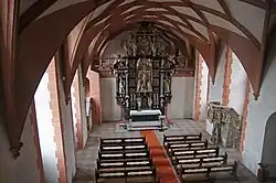 En las cuatro esquinas del patio hay unas pequeñas torres redondas en las que se encuentran las escaleras. La iglesia o capilla del palacio se halla en el ala norte y se extiende a través de la planta baja y superior, con una bóveda de crucería que hace referencia al estilo gótico. El altar de la capilla, hecho de alabastro y mármol, es de Hans Junckermulti. Cuenta con una estatua de Johann Schweikhard von Kronberg, sosteniendo una maqueta del palacio.[2]: 74
