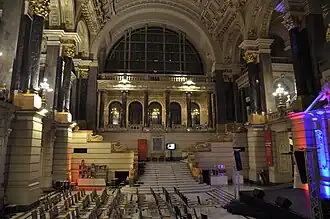 El acceso al edificio por la entrada principal conduce al Gran Salón (o Gran Vestíbulo), ubicado en el centro del edificio, un espacio notable de 40 x 18 metros y una altura de 24 metros diseñado «para dejar una impresión única en el visitante».[2] Su diseño, imitando la arquitectura interior de las termas Antoninas (los baños romanos de Caracalla)[6] en armonía con la bóveda pintada, le confiere un aire clásico. El color dominante de la sala, que reúne la mayor parte del enfoque artístico interior del edificio, es el dorado. Unas escalinatas a ambos lados conectan al vestíbulo con el primer piso, uniendo los despachos de las dos alas; en su día servía, entre otros, como sala de espera para el público, pero ya no tiene esta función.[2]