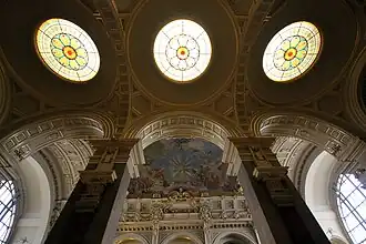 Un fresco alegórico de 200 m² cubre gran parte de la bóveda central, con el motivo del Triunfo de la Justicia, rodeado de decoraciones varias de color dorado. El elemento céntrico de esta obra de Károly Lotz, quien la basó en la pintura de Andrea Pozzo en la iglesia de San Ignacio de Loyola de Roma,[3] es la Dama de la Justicia en su gloria divina, rodeada de figuras alegóricas del poder protector de la ley y el derecho.[2] El fondo de la pintura retrata la bóveda como si fuera una ventana de cristal, sobre la cual se distingue la continuación del edificio con dos grandes arcos a ambos lados, y por encima de todo un cielo nublado. Las representaciones de la Justicia y algunas de las figuras posan en lo alto de un ático que también forma parte del edificio, mientras que el genio que imparte la justicia aparece al otro lado del fresco, directamente enfrente, también posado rodeado de figuras en un pedestal de la misma altura.