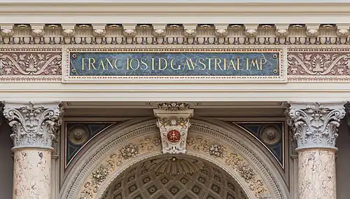 Los escudos incrustados en las enjutas de los arcos representan las entidades que formaban parte del Austria imperial, disueltas todas en 1918 con el desmembramiento del Imperio austrohúngaro, dando lugar a las distintas entidades territoriales de la actualidad.[4]