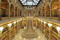 El espacio decorativo principal del Palacio consta de un gran vestíbulo de 31 x 15 metros, conocido como el ‘salón de actos’ (en alemán: Aula)[4] o ‘corte de las arcadas’.[10] Se trata de un extenso patio porticado de tres alturas, dos formadas por arcadas de mayor tamaño y la superior formada por pares de arcos más pequeños, separados por columnas en relieve rematadas con grandes bustos de mujer elaborados en gran detalle, y entre ellos paneles adornados. A una altura de 23 metro del suelo se extiende un techo de cristal a cuatro aguas, truncadas por una superficie conformada por cuatro grandes nichos cuadrados.[9]