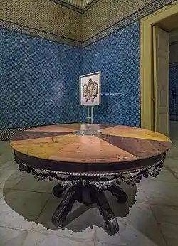 Estos cuadros, unos sesenta, llevan la firma de los maestros de la pintura europea de la época, como Charles Gleyre, Auguste Moynier, Alexandre de Belle, Charles-Philippe Larivière, Feodor Dietz, etc.[2] El palacio cuenta igualmente con mobiliario histórico diverso de fabricación local o importado. Entre los muebles más notables, se encuentran los tronos beylicales de mediados del siglo XIX decorados con pan de oro. Sin embargo, el mueble principal es el velador de 1881 donde se firmaron con 83 años de diferencia el tratado que establecía el protectorado francés, el 12 de mayo de 1881, y el decreto del presidente Habib Bourguiba, del mismo día de 1964, que nacionalizaba las tierras agrícolas ocupadas por los colonos.[2][5]