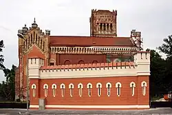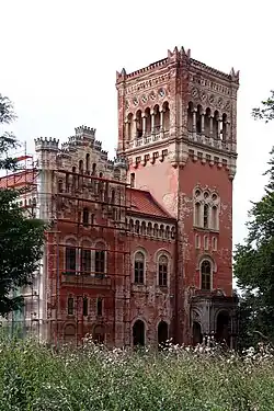 La fachada del edificio da al parque del palacio; tiene incorporada en su esquina oriental una torre campanario al estilo campanile de cuatro pisos y 34 metros de altura.[12] En la esquina oeste, identificable desde el exterior por su ábside semicircular, se encuentra la capilla de dos plantas; mientras que en la esquina norte de la propiedad destaca un amplio avant-corps, cuyo hastial está realzado por una galería enana y un merlón almenado. Por delante de la fachada principal se extiende un amplio balcón, bajo el cual se encuentra la entrada principal al edificio. La balaustrada, dividida en arcos conopiales y rosetones, descansa sobre columnas de perfil esbelto. Los frontones a dos aguas en las fachadas sureste y norte son casi idénticos. De hecho, muchos de los elementos arquitectónicos del edificio, con su particular decoración, se repiten en todos los frentes; estos incluyen las ventanas de arco de medio punto, las galerías enanas translúcidas bajo el socarrén, las torrecillas esquineras con sus paneles almenados y las galerías abiertas que dan hacia el patio.