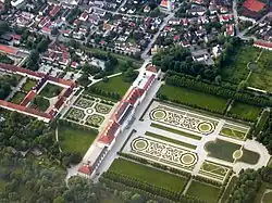 Vista del Palacio Nuevo desde el Palacio de Lustheim con el canal entre ambos. -
