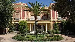 La entrada se realiza a través de un jardín protegido por una verja de fundición. Se accede al interior del inmueble mediante un pórtico adintelado de tres vanos divididos por dobles columnas a cada lado sobre pedestales que soportan un pretil de terraza que a su vez se apoya lateralmente en los cuerpos salientes del edificio. Desde el citado pórtico se llega a tres arcos cubiertos con reja, siendo el central la puerta de entrada, esta da paso a un espacio rectangular que comunica con el patio principal de estilo barroco, el cual presenta planta rectangular y un alzado de dos pisos.