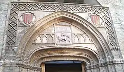 En las albanegas aparecen dos medallones cuadrilobulados que albergan escudos con la imagen de la insignia del rey de Aragón. En el tímpano resultante entre los arcos se dispone una banda de arquillos ciegos mixtilíneos entrecruzados, que de nuevo remiten a las series del palacio hudí. Esta franja se ve interrumpida por un recuadro que aloja un relieve incorporado recientemente.