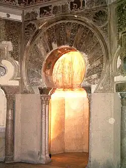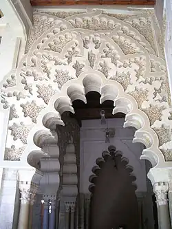 El frontal del mihrab se conforma mediante un arco de herradura muy tradicional, de formas cordobesas y rosca de dovelas alternadas, unas decoradas con relieves vegetales y otras lisas (aunque en origen estuvieron adornadas con decoración pictórica), que recuerdan la rosca del mihrab de la Mezquita de Córdoba, si bien lo que allí fueron materiales ricos (azulejería de mosaicos al estilo bizantino), en Zaragoza -con menos fasto y presupuesto que la Córdoba califal- son estucos en yeso y policromía típica del alarifazgo morisco, decoración que se ha perdido casi en su totalidad en el Palacio. Siguiendo con el arco de la portada, un alfiz enmarca su trasdós, en cuyas albanegas aparecen rehundidas dos rosetas gallonadas, como también lo es la cúpula del interior del mihrab.