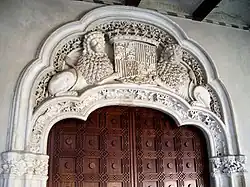 Destaca la portada principal de acceso al salón del trono: de arco rebajado trilobulado, guarnecido con un tímpano de cinco lóbulos, en cuyo centro aparece representado el escudo de la monarquía de los Reyes Católicos, en el que figuran los blasones de los reinos de Castilla, León, Aragón, Sicilia y Granada, sostenido por dos leones tenentes. El resto del campo decorativo se acaba con una delicada ornamentación vegetal de factura calada, que reaparece en los capiteles corridos de las jambas. Toda la portada está trabajada en yeso endurecido, que es el material predominante a cara vista en los interiores de la Aljafería, pues los artesanos mudéjares perpetúan los materiales y técnicas habituales en el islam.