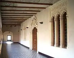 En el mismo paramento escoltan el ingreso dos amplios ventanales de triple arco mixtilíneo con celosías caladas sobre sus claves, gracias a los cuales se ilumina el espacio interior de las salas regias.
