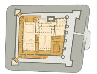 ![]() Planta de la Aljafería restaurada (marrón oscuro: hemiciclo y dependencias de las Cortes de Aragón; gris, foso) | ||