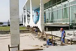 ![]() Entrada al Palacio da Alvorada. En primer plano, el grupo escultórico As banhistas, de Alfredo Ceschiatti. | ||