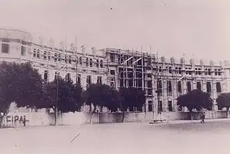 Para finalizar el impasse y empezar la obra que contribuiría a paliar el paro obrero de Melilla, la comisión de Fomento recomendó que si no se podía adaptar el proyecto, ya que debería estar últimado entre junio y julio de 1932, se hiciese otro de acuerdo con las posibilidades económicas del momento, siendo realizado este por Enrique Nieto, basándose en el proyecto de Ferrero y Fernández, siendo aprobado el 12 de enero de 1934. Al quedar desiertos lo concursos para su construcción, el 17 de mayo de 1935 se decide construir el edificio por la Administración, por etapas con los presupuestos anuales, por una comisión ejecutiva. El 8 de julio de 1935 se derriban las verjas y muros que cercan el solar, calculando en septiembre de 1935 los cimientos Nieto, en los inicios de 1936 se acuerda anunciar un nuevo concurso para las obras, pera el mes antes se inicia la Guerra Civil Española que paralizo su construcción. La primera piedra se colocó el 16 de diciembre de 1938 gracias a una anticipo del Alto comisario de España en Marruecos, en septiembre de 1940 se acuerda un préstamo, realizado en octubre, en noviembre se presenta el proyecto de las losas de cimentación, y en diciembre la documentación gráfica del resto, entre finales de 1942 y 27 de marzo de 1943 se cimenta, con problemas en el suministro de cemento, así como en el de hierro, pues Andrés Alcaraz Márquez rescindirá el contrato de construcción al no haber hierro, aún con la autorización por parte de la Dirección General de Arquitectura de emplear una estructura metálica, siendo adjudicadas las obras otra vez a Construcciones Lamseal, aunque al falta de hierro obliga a sustituir este por el hormigón armado, con proyecto del arquitecto de caminos Daniel Lambea, estudiado por Alejandro Blond González. Nieto se jubila en octubre de 1948 y pide continuar con las obras, siéndole concedido el 15 noviembre de ese año la posibilidad de continuar su labor hasta el 31 de mayo de 1949, si bien los trabajos, remates finales no se terminan hasta finales de 1949, siendo el 13 de octubre visitado. A principios de 1948 Nieto diseño una cristalera, la solería del Salón Dorado y las balaustradas del Hall, reformado en noviembre de ese año. Ramos realiza unos bocetos de frescos para el techo del Salón Dorado y el mobiliario es adjudicado a la Casa Palmer.
