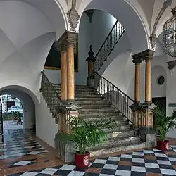 Por entonces se construyó también la escalera que arranca de la crujía meridional del patio y pone en comunicación las dos plantas del edificio. Es de tipo imperial con caja cuadrangular. Muestra un primer tiro sencillo y centrado, que se divide en dos laterales paralelos a partir de un descanso, completando así la cuadratura de la planta. Está realizada con mármoles de diversos colores, embutidos y taraceados, consiguiéndose una obra de gran prestancia, relacionada por su estética con Gómez de Sandoval. Se cubre con una cúpula semiesférica decorada con relieves policromados que representan escenas de la vida de San Pedro Nolasco.