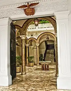 En el segundo piso hay un patio andaluz, de fuerte influencia Colonial, entre cuyas columnas se encuentran cinco esculturas que representan la ley, la justicia, el trabajo, la constancia y el deber. Estas esculturas de las virtudes fueron esculpidas por Gaetano Olivari, escultor italiano, en 1915.[5]