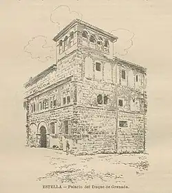Este edificio también fue utilizado, desde 1868 a 1954,[1][9] como cárcel siendo, por ello, necesario cegar varios de los vanos de la fachada principal. Fue escenario literario de la novela de Pío Baroja, Zalacaín el Aventurero. En esta prisión pasó sus últimas horas, junto a otras personas, el alcalde de Estella, Fortunato Aguirre, antes de su fusilamiento en 1936.