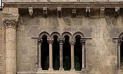 Los capiteles sobre los que se apoyan los arquillos de las ventanas muestran un temática muy variadas (motivos florales y faunísticos, combates a espada entre soldados, combates entre leones, así como seres mitológicos en actitudes diferentes). Varios de ellos fueron resultado de las tareas de restauración llevadas a cabo a finales del siglo XX.[20]