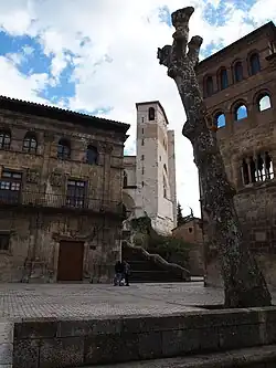 El elemento más significativo es la fachada sureste, la principal, situada frente a la escalinata de San Pedro de la Rúa. Consta como elementos originales de una planta baja más un altura, construidas en sillería, que están divididos por una cornisa moldurada sencilla. El cuerpo inferior constituye una galería de cuatro arcos de medio punto sobre machones siendo menor el arco de la parte oriental. En la planta superior el piso muestra cuatro ventanales de cuatro arquillos (varios repuestos en restauraciones recientes) cada uno rematados por un alero apoyado en ménsulas que asemeja un tejaroz tras recrecer la altura del edificio con una nueva planta posterior. Esta fachada está enmarcada por dos columnas adosadas al muro que jalonan el conjunto y que, partiendo de la base, alcanzan hasta el tejaroz.[2] Muestran ambas columnas capiteles con decoración de tipo vegetal (columna derecha) y figurativo (columna izquierda). Debajo del tejaroz se culmina el nivel con una cornisa de canecillos decorados.[12]