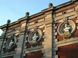 Durante los trabajos de restauración de Pedro Falqués se decidió colocar en la fachada de las dos nuevas naves laterales un conjunto de bustos dedicados a personajes vinculados con el arte, ya fuese artistas o historiadores, casi todos ellos catalanes. Realizados en mármol, fueron colocados en hornacinas circulares a todo lo largo de las fachadas del edificio (frontal, posterior y laterales), entre 1909 y 1911. Son un total de 28 que, desde el extremo izquierdo de la fachada principal y yendo de izquierda a derecha son: Nicolau Travé (Damià Pradell), Blas Ametller (Joan Carreras), Lluís Dalmau (Anselm Nogués), Pere Pau Muntanya (Manuel Fuxá), Pere Pasqual Moles (Josep Soler Forcada), Manuel Tramulles (Josep Reynés), Los Vergós (Dionisio Renart), José Luis Pellicer (Pablo Gargallo), Salvador Mayol (Eduard B. Alentorn), Mariano Fortuny (Antonio Parera), Joseph-Bernard Flaugier (Miquel y Luciano Oslé), Vicente Rodés (Joan Centelles), Elías Rogent (Manuel Fuxá), Antonio Viladomat (Josep Reynés), Jerónimo Suñol (Antonio Parera), Jaume Ferrer Bassa (Pere Carbonell), Joaquín Vayreda (Josep Canalias), Pablo Rigalt (Enric Clarasó), Lluís Borrassà (Pere Carbonell), Ramón Amadeu (Ismael Smith), Damià Campeny (Agapito Vallmitjana), Ferdinando Galli Bibbiena (Rafael Atché), El maestro Alfonso (Josep Montserrat), Los Planella (Miquel y Luciano Oslé), Luis Rigalt (Venancio Vallmitjana), Francesc Soler Rovirosa (Josep Carcassó), Benito Mercadé (Venancio Vallmitjana) y Joan Soler Faneca (Antonio Alsina).[9]