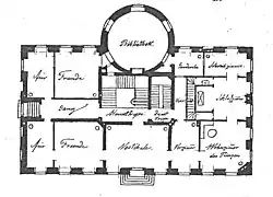 El edificio era de planta rectangular y se realizó en estilo neoclásico. Contaba con tres pisos elevados sobre un zócalo que albergaba con una planta semisótano. En el piso inferior se situó en algún momento el apartamento del príncipe Carlos. El palacio contenía una habitación conocida como Blauerzimmer o cuarto azul.