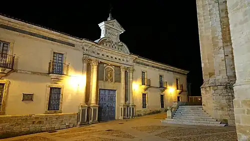 El patio data del siglo XV y es probablemente pertenencia de un edificio anterior, la fachada se ha realizado en estilo manierista y su portada asemeja a un arco de triunfo. Junto al edificio se encuentra la afamada Puerta del Obispo (denominada también como Puerta Óptima). El edificio se re-edificó en 1762 en el obispado de Cavanillas. Es un edificio compuesto de dos plantas en torno a un patio porticado.[4] En torno al patio se distribuyen los diversos servicios del episcopado.