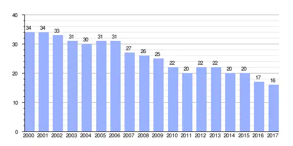 | Gráfica de evolución demográfica de Palacios de Rueda[2] entre 2000 y 2017 |
