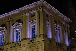Su estructura está formada por un pórtico inferior con trece arcadas que da un fuerte sentido de claroscuro. La planta superior se compone de quince ventanas con frontones triangulares y curvilíneos, separados por columnas dobles de estilo clásico.