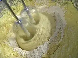 La formación de la masa se compone de dos subprocesos: la mezcla y el trabajado (amasado). La masa comienza a formarse justo en el instante cuando se produce mezcla de la harina con el agua. En este momento el medio acuoso permite que aparezcan algunas reacciones químicas que transforman la mezcla en una masa casi «fibrosa», esto es debido a las proteínas de la harina (gluten) que empiezan a alinearse en cientos de cadenas. Al realizarse la mezcla entre la harina y el agua, formándose la primera masa antes de ser trabajada; algunos panaderos opinan que es mejor dejar reposar aproximadamente durante 20 minutos con el objeto de permitir que la mezcla se haga homogénea y se hidrate por completo (permite actuar a las moléculas de glutenina y de gliadina en la harina).[25] La elaboración de la masa se puede hacer a mano o mediante el empleo de un mezclador o incluso de un robot de cocina (estos últimos tienen la ventaja de exponer la masa durante poco tiempo al oxígeno de la atmósfera). Algunos panaderos mencionan la posibilidad de airear la harina antes de ser mezclada para que pueda favorecer la acción del amasado.[26] Durante la fase de mezclas algunas enzimas (lipooxigenasa y polifenol oxidasa) actúan en la destrucción de los carotenoides.[35] Al acto de trabajar la masa se denomina amasar. En otros idiomas este verbo es más específico de la masa de harina, como puede ser kneading (knead) en inglés que viene a significar algo así como «comprimir en una bola», en francés se denomina pétrissage.