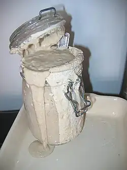 - Levadura fresca: obtenida inmediatamente de una fermentación y posteriormente refrigerada en forma de cubos (de 50 g aproximadamente) con textura de pasta comprimida que poseen una vida útil de escasas semanas. Los elaboradores de pan suelen preferir este tipo de levadura, el problema es que posee una vida media inferior a otras levaduras.[19] La levadura fresca es similar a la levadura seca, la única consideración es que debe emplearse el doble; por ejemplo, si una receta de pan indica 25 g de levadura seca, en ese caso se empleará el doble de levadura fresca (es decir 50 g).[23]