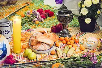El pan de muerto es uno de los elementos del altar de muertos. Se ofrecen ritualmente para alimentar a las almas de los seres queridos, que durante las fechas señaladas viajan desde el más allá para visitar a sus hogares.[25] El altar también suele incluir fruta, papel picado, flores de cempasúchil, un plato con sal, juguetes, copal oloroso, cruces y otra simbología religiosa, las fotos de los fallecidos, sus objetos personales y varios vasos de agua, uno por persona.