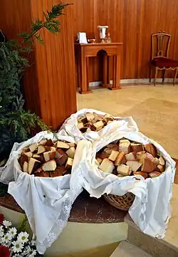 Concluida la procesión, el sacerdote oficiante realiza la bendición del pan dormido contenido en las cestas, cantándose a continuación los tradicionales «Gozos» del santo. Tras el canto de los Gozos tiene lugar el singular reparto, para lo cual dos cofrades, cada uno con su cesta, se colocan junto a las puertas del atrio exterior. Conforme van saliendo del templo, los fieles cogen varios trozos del pan dormido -El reparto se realiza entre todos los feligreses que asisten ese día a la iglesia, no solo entre los pobres como sucedía con el «pan de los pobres» de san Antonio de Padua-: Antaño, algunos vecinos únicamente iban a misa el día de San Antón, para recoger el pan del santo.[1]