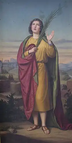 | Atributos | Palma de mártir, libro, coraza de legionario romano | |