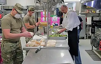 ![]() La Guardia Nacional de los Estados Unidos creando almuerzos preenvasados para refugios afectados por la pandemia en Anchorage, 8 de abril de 2020. | ||