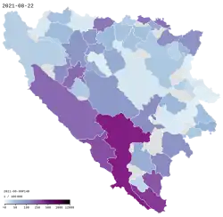 ![]() Mapa de municipios de Bosnia y Herzegovina con casos confirmados de coronavirus (a 18 de julio de 2020) | ||