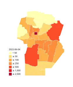 Nota: La última vez que el MinSalCba aportó el número de estudios efectuados para el diagnóstico de COVID-19 en la jurisdicción fue el 15 de marzo de 2022.[12] En un comunicado emitido el día anterior (14), se informó que los datos diarios con relación a la pandemia de COVID-19 en la provincia serían trasladados a un tablero digital desde el 16 del mismo mes. En el anuncio no se hizo mención sobre la inclusión del indicador de pruebas procesadas en el cuadro de mando.[13] Esto se confirmó cuando el dashboard fue publicado.