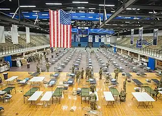 ![]() La Guardia Nacional de los Estados Unidos arman un hospital de campaña para pacientes COVID-19 en un espacio de la Universidad Estatal del sur de Connecticut en New Haven, 1 de abril de 2020. | ||