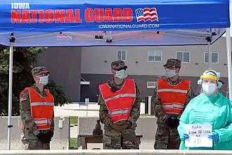 ![]() La Guardia Nacional de los Estados Unidos realizando pruebas para detectar COVID-19 en Des Moines, 25 de abril de 2020. | ||