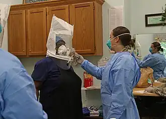 ![]() La Guardia Nacional de los Estados Unidos entregando máscaras de protección avanzada contra COVID-19 en la casa de reposo Homestead of Topeka, 8 de mayo. | ||