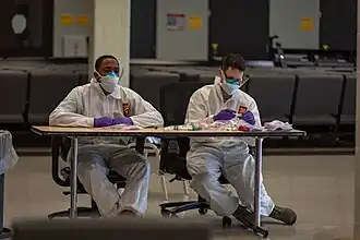 ![]() Miembros de la Guardia Nacional de los Estados Unidos en el Condado de Bledsoe en una mesa para realizar pruebas, 9 de abril. | ||