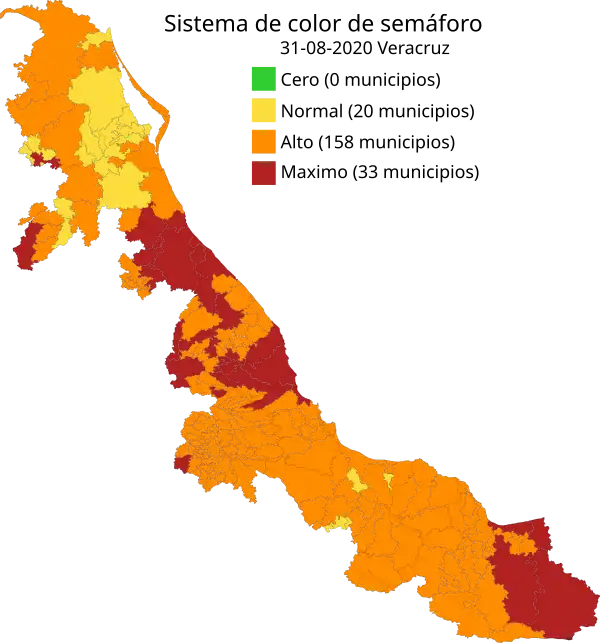 14 de agosto: El estado de Veracruz supera los 25 mil casos confirmados de Covid-19.[149][150][151][152] Además la Secretaría de Salud del estado presenta el nuevo semáforo quincenal que abarca del 17 al 30 de agosto:[153] dejando a 104 municipios en rojo (riesgo máximo), 99 en naranja (riesgo alto) y 9 en amarillo (riesgo medio).[154]