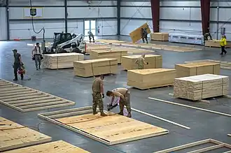 ![]() Los aviadores y soldados de la Guardia Nacional de los Estados Unidos construyendo una instalación de emergencia médica de 400 camas en Essex Junction, Vermont, 4 de abril. | ||