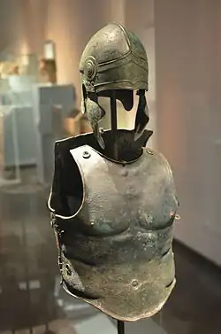Una panoplia es una vestimenta completa de armadura, la armadura completa de un hoplita o de cualquier soldado fuertemente armado. Por ejemplo el escudo (aspís), la coraza (thṓrax), la hombrera (epibraxiōníon), la ventrera (mitra), el casco (krános), la muslera (paramērídion), la greba (knēmis), la tobillera (episphýrion), la protección del antebrazo (epipēkhýon), la protección del pie (epipodíon) junto con la espada (xíphos) y la lanza (dóry).[1] La panoplia del hoplita podía llegar a pesar unos 35 kg.