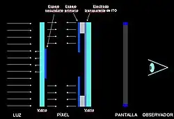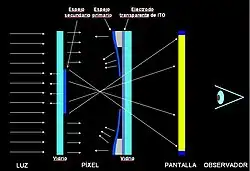 - Este diseño permite aumentar la cantidad de luz de la fuente que llega a la pantalla; con los experimentos realizados hasta ahora se llega alrededor del 36%, que supone unas tres veces más luz que la que emite una pantalla LCD.