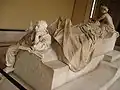 Eduardo Dato, de Mariano Benlliure, en mármol y bronce. Una mujer de luto alza una cruz sobre la efigie yacente del político, mientras a los pies de este dos amorcillos flanquean el escudo de España.