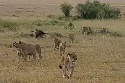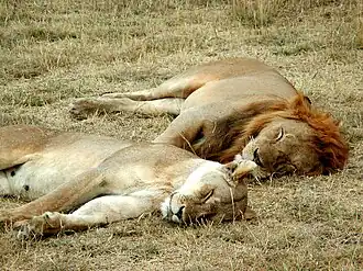 Los leones son predadores carnívoros con dos tipos de organización social. Algunos son residentes que viven en grupos llamados manadas.[55]​ El grupo suele consistir en aproximadamente cinco o seis hembras emparentadas, sus crías de ambos sexos y uno o dos machos conocidos como la «coalición», que se aparean con las hembras adultas (aunque se han observado grupos extremadamente grandes de hasta treinta individuos). La coalición de machos de un grupo suele consistir en dos machos, pero puede aumentar hasta cuatro y después volver a bajar. Los machos son expulsados de su grupo materno cuando alcanzan la madurez.