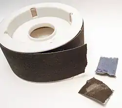 La tela de esmeril es un tipo de abrasivo revestido que tiene esmeril pegado a una tela. Se utiliza para trabajar el metal a mano. Puede venderse en hojas o en rollos estrechos, típicamente de 25 o 50 mm de ancho, a menudo descritos como "cinta de esmeril". El respaldo de tela hace que la tela de esmeril sea más resistente a la tensión que el papel, pero aun así permite que una hoja se rompa convenientemente a medida. El esmeril (en gran parte desplazado por productos mejorados como el óxido de aluminio y el carburo de silicio) se utiliza para fregar superficies muy desgastadas y ásperas hasta obtener un acabado liso y brillante, especialmente en la relojería.[11] El papel de esmeril, más comúnmente, tiene un respaldo de papel y generalmente es un grano más fino.