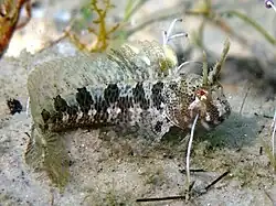 Vive pegado al fondo demersal, en el mar o en agua salobre; los adultos suelen estar en fondos arenosos con rocas y vegetación, escondidos en grietas.[6]