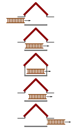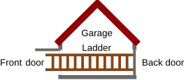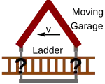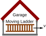 Se trata de una escalera que viaja horizontalmente a una velocidad relativista (cercana a la velocidad de la luz, como por ejemplo, un valor del 90% o 0,9 c) paralela al suelo, y, por tanto, sufre una contracción de longitud de Lorentz. Ahora, debe imaginarse que la escalera pasa a través de las puertas delanteras y traseras (abiertas) de un garaje o granero, cuyo espacio interno es inferior a la longitud de la escalera (longitud en reposo), por lo que si la escalera no se moviera, no podría caber dentro del granero.