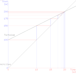 En la paradoja de Aquiles y la tortuga, Aquiles está disputando una carrera contra una tortuga. Aquiles concede a la tortuga una ventaja, por ejemplo, de 100 metros. Suponiendo que ambos comiencen a correr a una velocidad constante (uno muy rápido y la otra muy lenta), tras un tiempo finito, Aquiles correrá 100 metros, alcanzando el punto de partida de la tortuga. Durante este tiempo, la tortuga ha corrido una distancia mucho más corta, digamos que de 10 metros. Aquiles tardará un poco de tiempo más en recorrer esta distancia, intervalo en el que la tortuga habrá avanzado un poco más; por lo que a Aquiles aún le queda algo más de tiempo para llegar a este tercer punto, mientras la tortuga sigue avanzando. Por lo tanto, cada vez que Aquiles llega a algún lugar donde ha estado la tortuga, todavía tiene algo de distancia que recorrer antes de que pueda alcanzarla.[15]