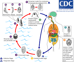 Los huevos salen por el esputo u otras secreciones del cuerpo; los miracideos que salen al eclosionar los huevos buscan al primer hospedero intermediario, un caracol, por ejemplo de los géneros Semisulcospira, Oncomelania, Aroapyrgus, Pomatiopsis, Achatina o Potadoma, al cual infiltran, para luego convertirse en redias que salen al agua dulce en forma de cercaria e infiltran al segundo hospedero intermediario, a algún cangrejo de agua dulce, en el cual se enquistan como metacercarias, que pasan al mamífero, desde cuyo tracto intestinal migran las duelas hasta los pulmones.